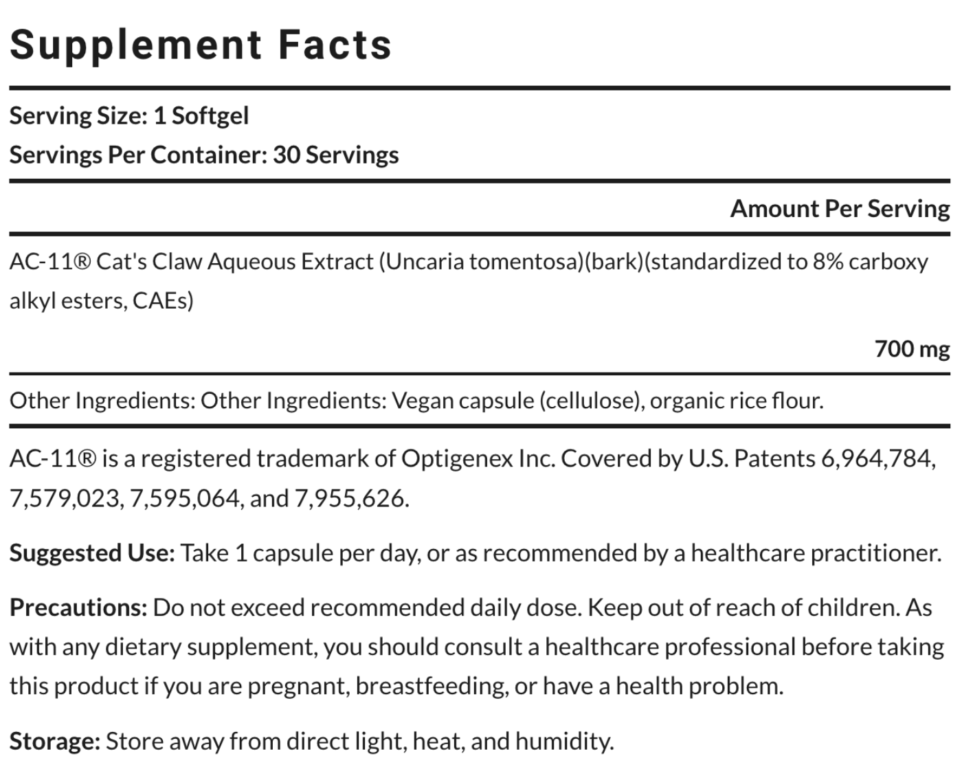 ac-11® is a safe, all-natural, and highly-effective aqueous extract of Cat’s Claw (Uncaria tomentosa), a traditional medicinal plant indigenous to the Amazon rainforest. ac-11® is radically different than other cat’s claw exctracts since it is practically free of alkaloids. Standardized to a minimum 8% Carboxy Alkyl Esters (CAEs), research demonstrates ac-11®’s natural ability to help the body repair its DNA. Additional studies have also shown ac-11®’s ability to: support your body’s inflammation response, help rid the body of damaged cells, enhance immune function, and decrease the rate of telomere truncation.